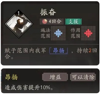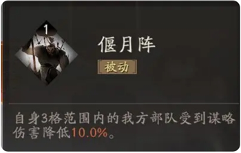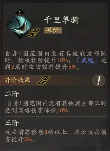 任何星级都推荐必带的数值怪被动技能,通过走位可以轻易大幅增加自己的属性,范围指的是自身周围9宫格。增攻效果能提高关羽的斩杀阈值,确保很多时候非人为触发<拖刀计>带来的减少主动伤害的效果。