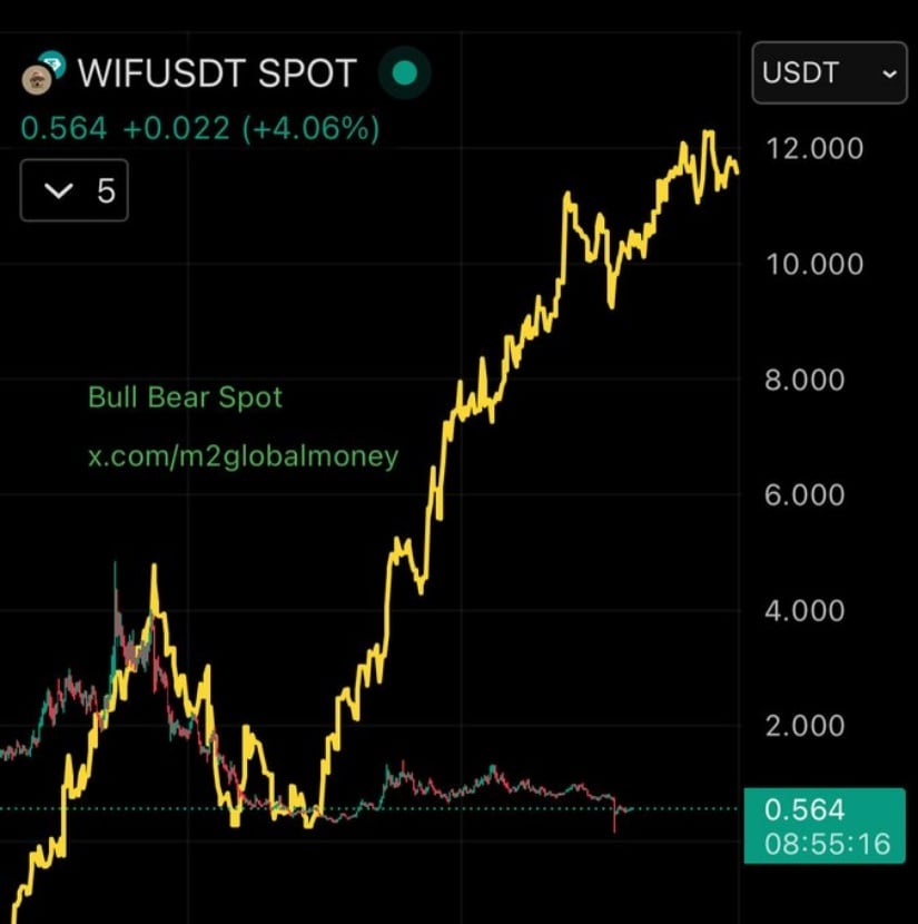 当前最值得关注的是飙升的全球流动性与该代币平稳走势之间不断扩大的鸿沟。这种背离表明WIF尚未充分反映流动性扩张的影响,分析师称之为"滞后性机会"。历史经验表明,当全球货币供应加速时,被低估或忽视的数字资产往往会在投机资金涌入下迎来爆发式补涨。