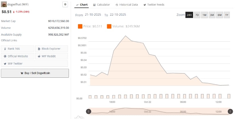 BraveNewCoin数据显示,dogwifhat当前报价0.51美元,24小时跌幅1.23%。代币市值5.1017亿美元,位列全球加密资产第166位,24小时交易量2.5065亿美元。