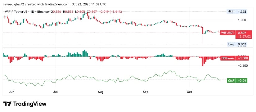 TradingView上WIF/USDT交易对现报0.507美元附近,日内跌幅约3.61%。图表结构显示自夏末以来长期横盘偏弱趋势,近期出现企稳信号,可能正在构筑底部。BBPower(布林带能量)指标读数-0.080,显示空头压力犹存但已初现走平迹象,暗示下行动能衰减。