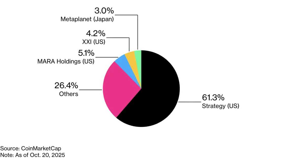 比特币在 10 月 6 日创下 126251 美元的历史新高,今年以来累计上涨 18%。这波涨势在很大程度上得益于大量专门囤积比特币的企业的涌现。由迈克尔·赛勒(Michael Saylor)掌舵、市值达 700 亿美元的比特币巨头 MicroStrategy 所开创的模式,已经在全球催生了数百家模仿者。这些公司大多的市值超过其持有的加密资产总额,凸显出投资者的强烈需求。