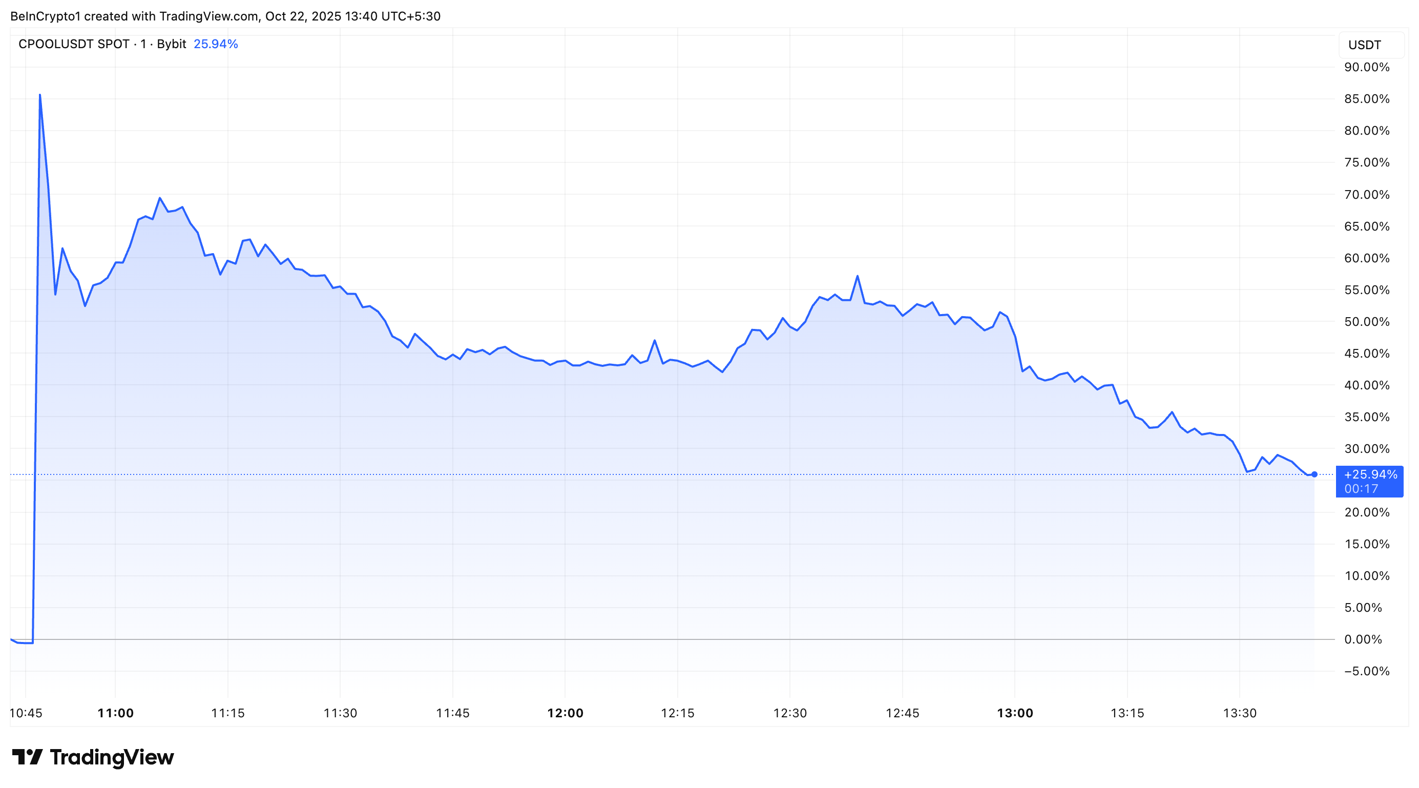 除价格外,交易活跃度同步攀升。CoinGecko数据显示CPOOL日交易量激增1,435.90%至6,900万美元,其中Upbit占比近26%。