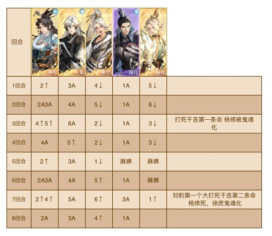 杨修必须第七回合死,这样徐庶血量最少才会被鬼魂化,杨修在颜良给盾之前就开大,还死不了的话给徐庶降攻击,刘豹加攻击。