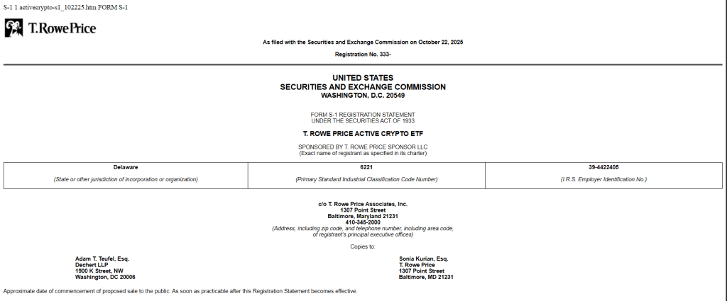 据监管文件和市场报告显示,管理着1.8万亿美元资产的美国资管巨头普信集团(T. Rowe Price)已提交申请,拟推出其首只加密货币交易所交易基金。该申请旨在向美国证券交易委员会注册一款主动管理型产品,让投资者能够投资一篮子数字代币,而非单一币种。