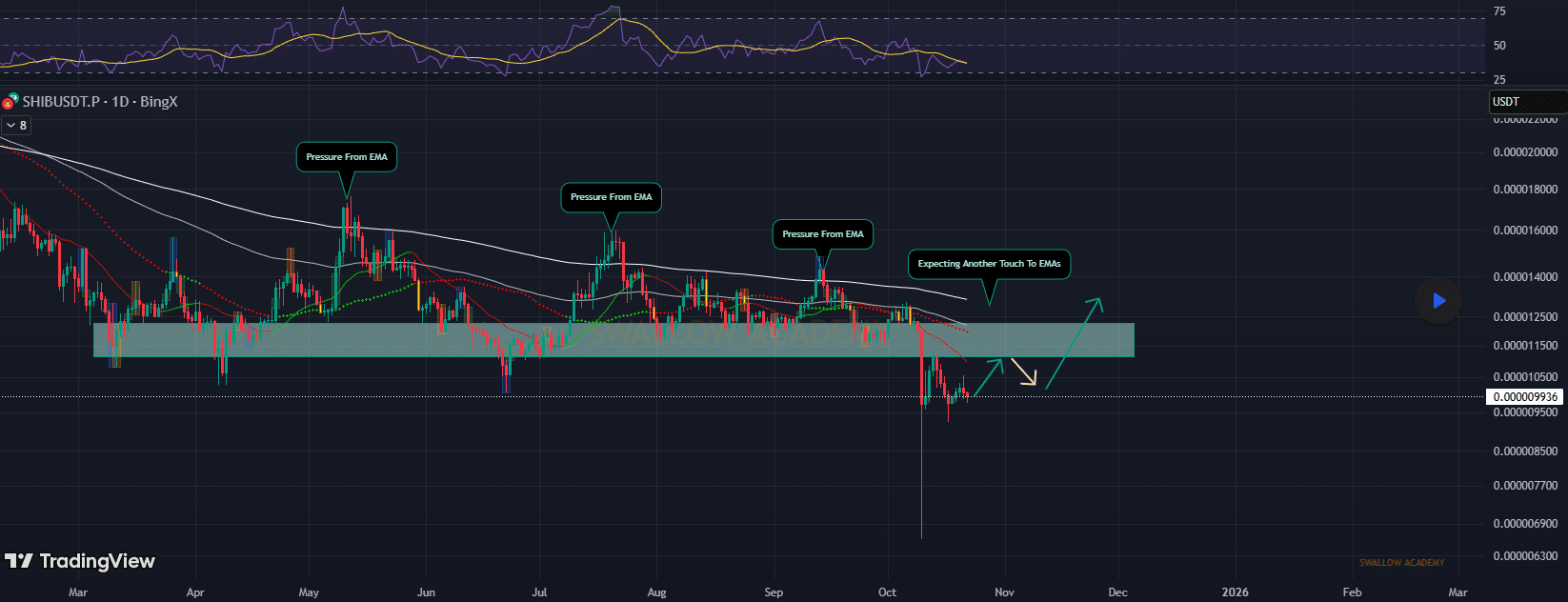 随着柴犬币持续获得支撑,一位分析师预测其将强势反弹并重新测试关键的日线指数移动平均线(EMA)阻力位。