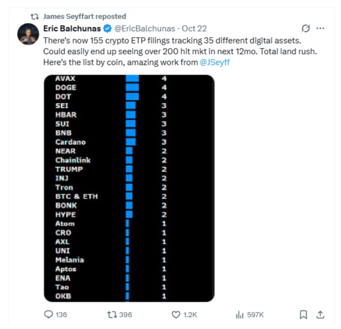 分析师Eric Balchunas在X平台预测未来一年将有近200种ETP面世。这些基金将覆盖35种以上加密货币,从迷因币到$BTC、$ETH、$SOL等蓝筹资产。