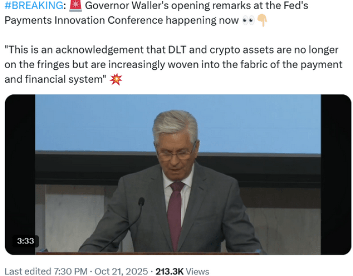 沃勒由特朗普首任期内任命,其讲话标志着与拜登政府加密态度的显著转向。