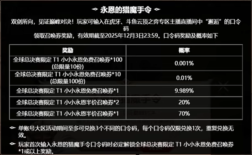 英雄联盟永恩的猎魔手令口令码,一剑斩开峡谷的T1永恩帅气值拉满,兑换口令有机会一发入魂!