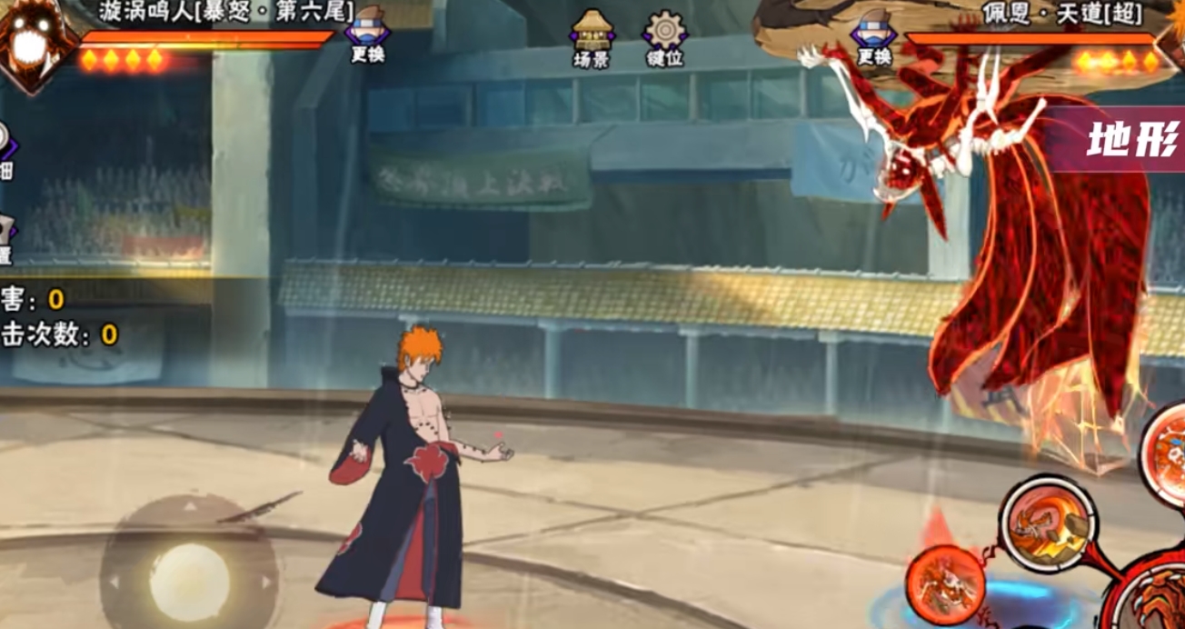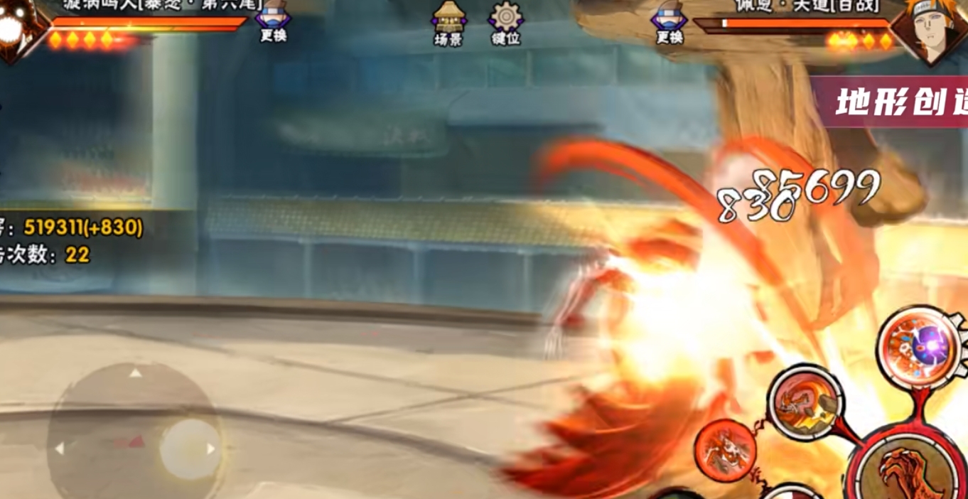 六尾鸣人的普通攻击共分为五段。第一段将敌人击退,第二段向前突进并转向,第三段通过旋转将目标击飞,第四段跳起后发射查克拉炮,第五段向前跳跃进行抓取。除第一段外,其他各段均可攻击倒地目标,且所有攻击段均可转向,第五段还可反向拉开身位。第三段跳起时与第四段空中阶段无法取消后摇,第五段命中后会掀起一块地形。角色血条下方设有三格能量,代表场景破坏值。每当第五段普攻或二技能第一段命中时,都会掀起地皮并增加一格能量。