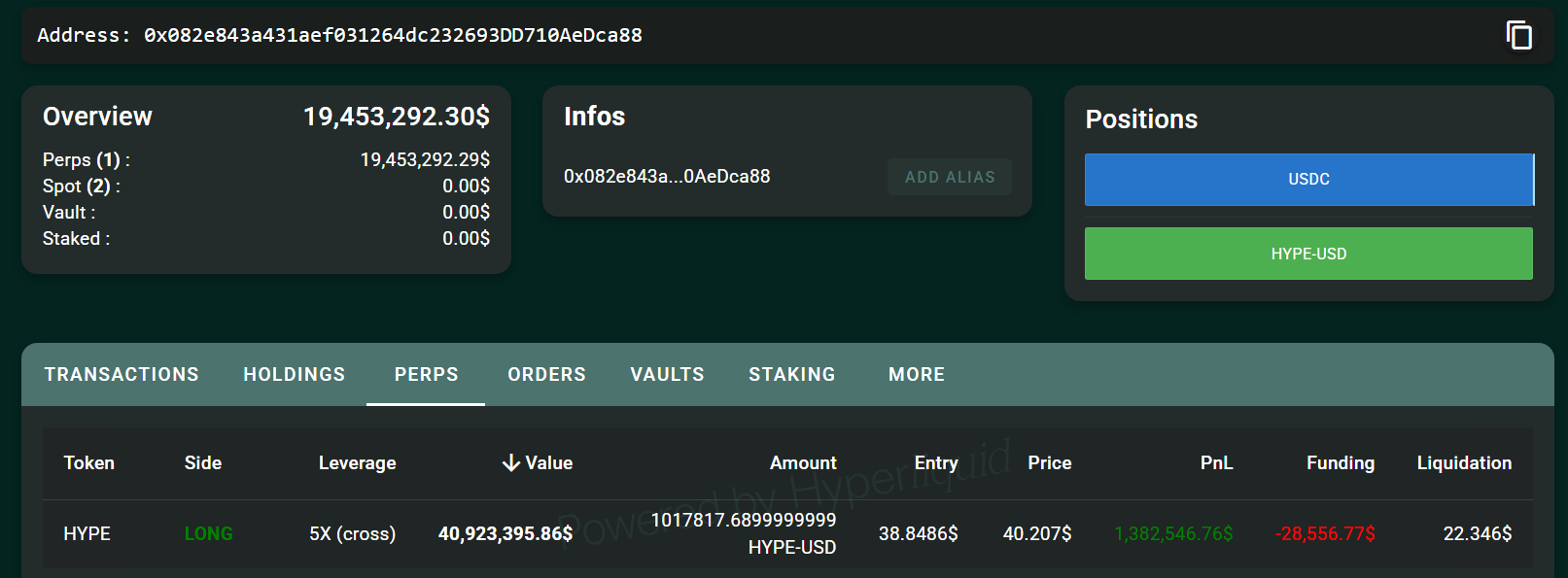 链上数据显示,该交易者以38.85美元均价开立5倍杠杆头寸,目前持仓超100万枚HYPE,总价值约4092万美元。