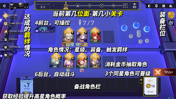 区别在于,不需要跑图,交互基本集中在一个类似于“棋盘”的界面。在“棋盘”界面进行招募角色、布置阵容凑羁绊、穿戴装备等等操作。