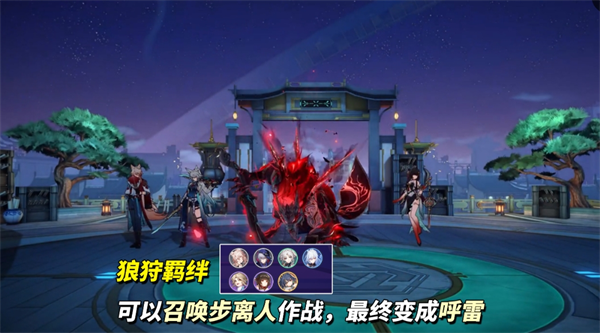 ②狼狩——椒丘、貊泽、飞霄、镜流、彦卿、灵砂、云璃。召唤步离人协同战斗,且随战斗获取经验逐步升级,最高可变成呼雷,并提供属性加成。越早凑齐羁绊越强。