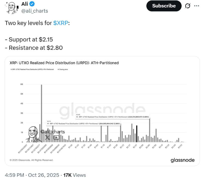 XRP现交易于关键位之间,2.15美元存在强支撑,2.80美元构成阻力。来源:@ali_charts via X