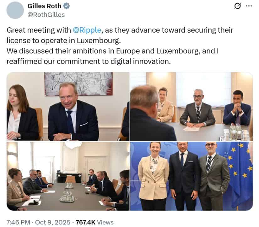 卢森堡财政部长与Ripple讨论牌照进展,重申支持其欧洲扩张与数字创新目标。来源:Gilles Roth via X