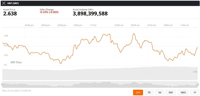 截至发稿,XRP报2.63美元,24小时跌幅0.33%。来源:Brave New Coin