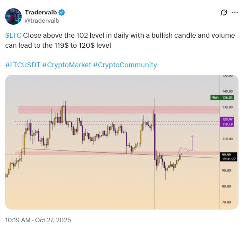 若日线能在强劲量能配合下收于102美元上方,莱特币(LTC)或将冲击119-120美元目标区间。来源:@tradervaib via X