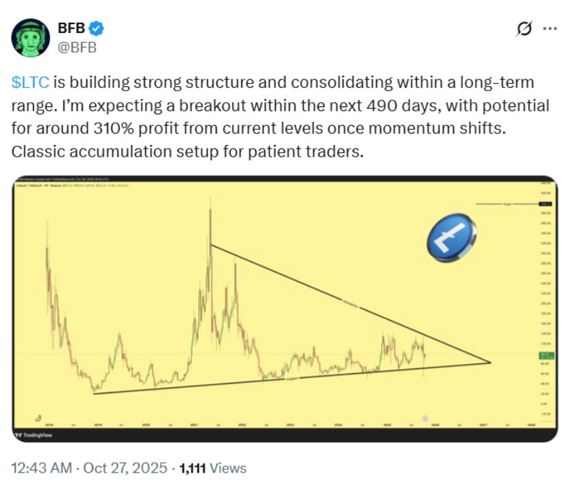 莱特币(LTC)正构筑坚实的长期整理形态,预示490天内可能出现突破行情,动能转换后或带来300%以上收益。来源:@BFB via X