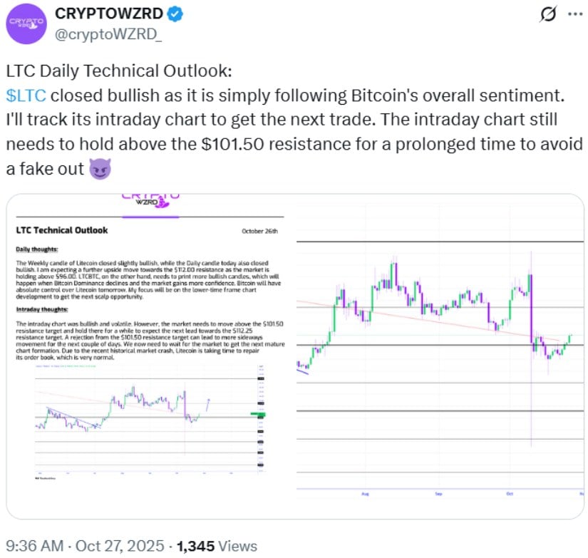 莱特币(LTC)虽跟随比特币情绪收涨,但守住101.50美元阻力位对确认动能至关重要。来源:@cryptoWZRD_ via X