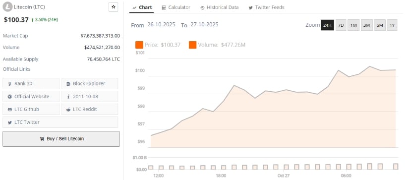 莱特币现报100.37美元,24小时涨幅3.50%。来源:Brave New Coin
