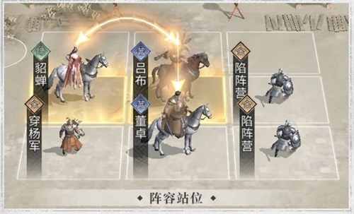 站位:吕布貂蝉互踩追击格,同时吕布踩中董卓提供的追击格,同时使用生存能力较强的盾兵吸收部分伤害如果董卓的养成程度比较高,则可以上阵更多输出兵种增强多穿能力。