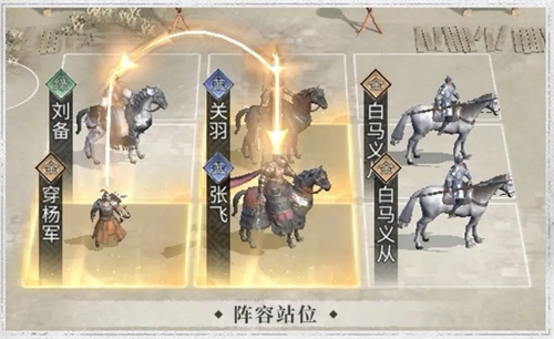 站位:需要让关羽踩到刘备、张飞二位的追击格,以最大化关羽的输出;刘备的另一个追击格可考虑上阵有着不错词条和属性的弓兵、术士,往往也能打出不俗的输出。