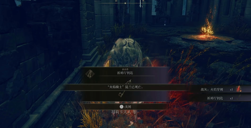 随后传送至赐福“大道旁的十字记号”,向北沿坡道上行,经废墟区无视火焰罐小怪,直达尽头标有“圣战教堂”的破旧教堂。昆兰本尊位于祷告台前,此次为实体形态,血量更厚且新增两招:单手拍地释放三道直线火墙(需斜向跑动或翻滚穿越缝隙)、后撤步朝天发射火球(落地生成持续岩浆区域)。建议召唤骨灰吸引仇恨,绕至背后输出。注意其火焰突刺未命中时存在较大硬直,但后续横扫需及时中断攻击后撤。残血时昆兰会连续释放三次火墙,第三次结束后的喘息阶段是绝佳输出时机。击败后掉落祈祷室钥匙与战灰“火焰穿刺”。钥匙可开启教堂侧门获取火焰祷告,战灰适用于戟、矛等突刺武器,战技为蓄力火焰冲刺刺击,冲击力强且易对人形怪造成硬直。