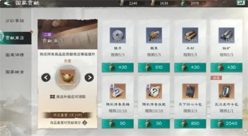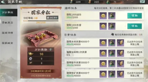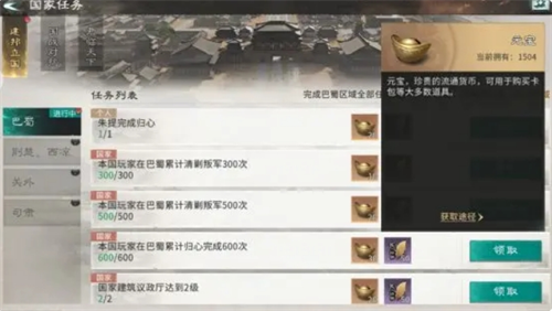任务系统:除了主线任务以外,任务系统中还有国家任务、日常任务、循环任务等,可以产出大量奖励,包括国家贡献、民心经验、元宝等。