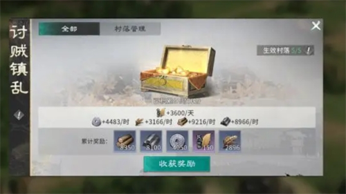 村落产出:当完成收复城池、剿灭叛军以后,即可获得村落,作为主公们的食邑,可以源源不断的产出各种基础资源,资源累计上限为48小时,超过后不再累计,主公们不要忘记每天领取。