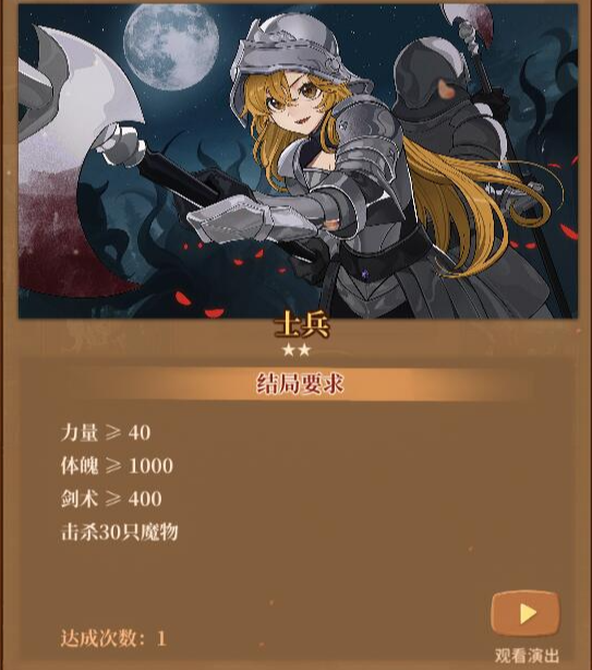 3、士兵2星:力量≥40、体魄≥1000、剑术≥400、击杀30只怪物。