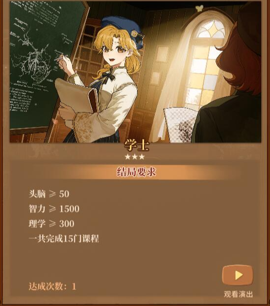 2、学士3星:头脑≥50、智力≥1500、理学≥300、一共完成15门课程。