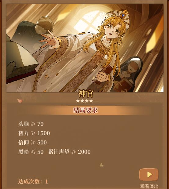 2、神官4星:头脑 ≥70、智力≥1500、信仰≥500、黑暗≤50、累计声望≥2000。