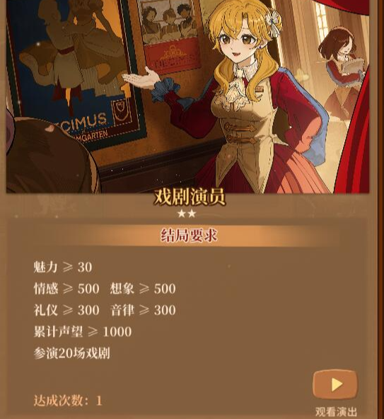 3、戏剧演员2星:魅力≥30、情感≥500、想象≥500、礼仪≥300、音律≥300、累计声望≥1000、参演20场戏剧。