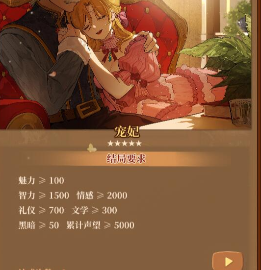 1、宠妃5星:魅力≥100、智力≥1500、情感≥2000、礼仪≥700、文学≥300、黑暗≥50、累计声望≥5000。