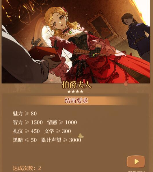 2、伯爵夫人4星:魅力≥80、智力≥1500、情感≥1000、礼仪≥450、文学≥300、黑暗≤50、累计声望≥3000。