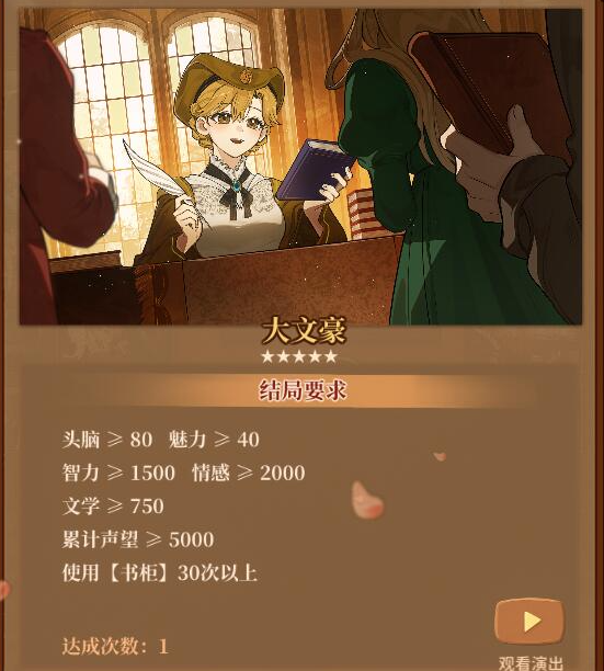 1、大文豪5星:头脑≥80、魅力≥40、智力≥1500、情感≥2000、文学≥750、累计声望≥5000、使用【书柜】30次以上。