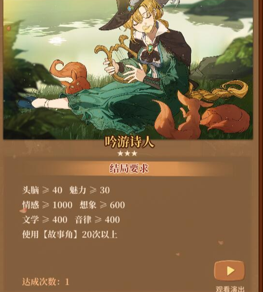 2、吟游诗人3星:头脑≥4、0魅力≥30、情感≥1000、想象≥600、文学≥400、音律≥400、使用【故事角】20次以上。