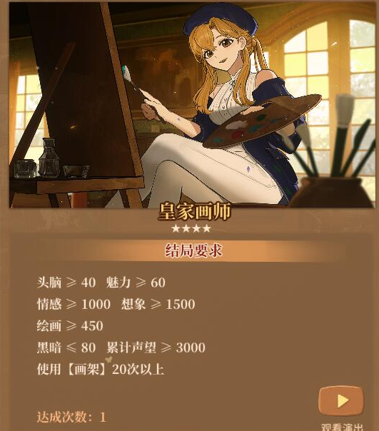 2、皇家画师4星:头脑≥40、魅力≥60、情感≥1000、想象≥1500、绘画≥450、黑暗≤80、累计声望≥3000、使用【画架】20次以上。