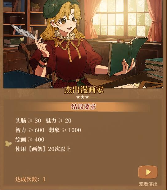3、杰出漫画家3星:头脑≥30、魅力≥20、智力≥600、想象≥1000、绘画≥400、使用【画架】20次以上。