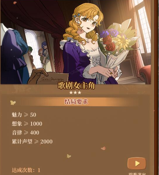 3、歌剧女主角3星:魅力≥50、想象≥1000、音律≥400、累计声望≥2000。