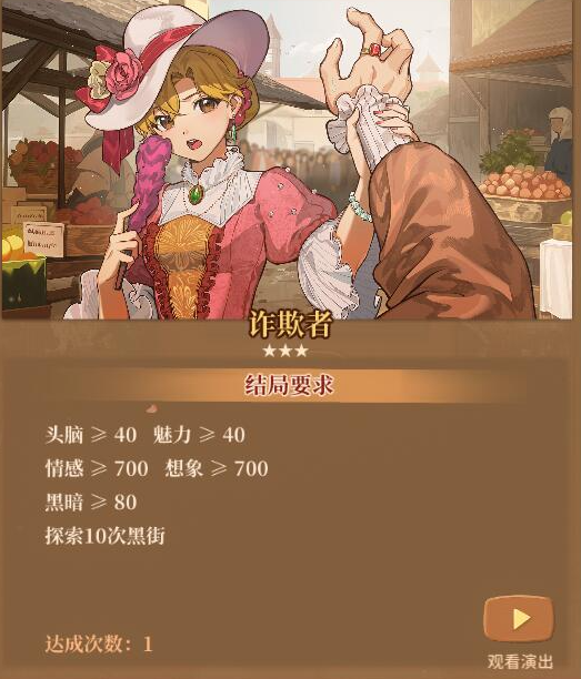4、诈欺者3星:头脑≥40、魅力≥40、情感≥700、情感≥700、黑暗≥80、探索10次黑街。
