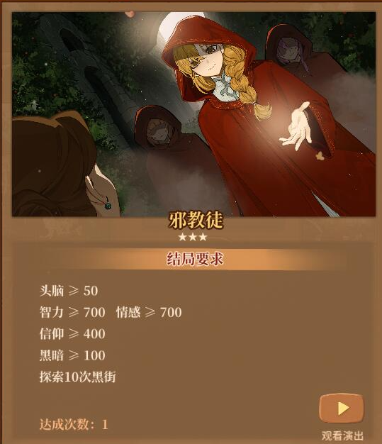 5、邪教徒3星:脑≥70、智力≥1500、情感≥1000、信仰≥500、黑暗≥100、探索10次黑街。