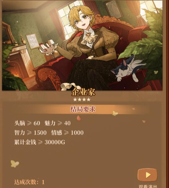 2、企业家4星:头脑≥60、魅力≥40、智力≥1500、情感≥1000、累计金钱≥30000G。