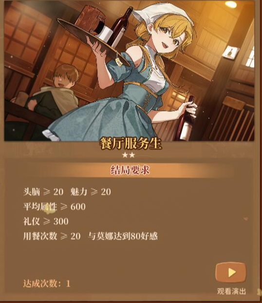 1、餐厅服务生2星:头脑≥20、魅力≥20、平均属性≥600、礼仪≥300、用餐次数≥20、与莫娜达到80好感。