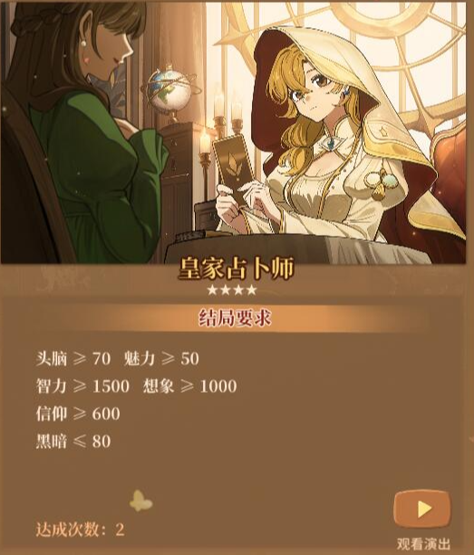 2、皇家占卜师4星:头脑≥70、魅力≥50、智力≥1500、想象≥1000、信仰≥600、黑暗≤80。