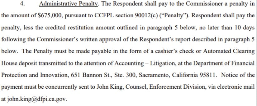 根据2025年10月30日签署的和解令,Coinhub须在监管批准后60天内全额支付67.5万美元罚款,并向受影响加州消费者赔偿。该公司还必须建立新合规制度,未来一年每60天向监管机构提交进度报告。