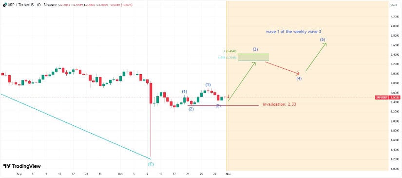 从技术形态看,XRP当前结构与既往牛市初期相似——长期盘整后往往伴随急剧拉升。若有效突破2.50美元,短期目标可看至2.70美元和3.00美元,延续十月回调后的复苏趋势。但若跌破2.35美元,可能下探2.10美元支撑区。