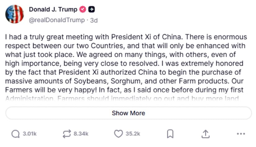 要理解此协议对加密市场的重要性,需回溯数周前事件。10月9日,中国宣布新的严格稀土出口许可制度。10月10日,特朗普威胁自11月1日起对所有中国进口商品征收100%关税。