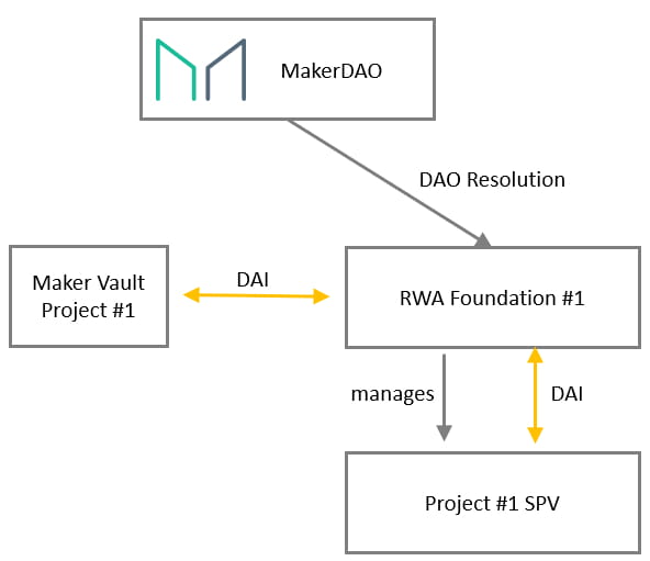 为了有效管理 RWA 业务,MakerDAO 成立了 RWA Foundation。根据抵押品类型的不同,可能设立不同的 Foundation,并且每个特殊目的实体(SPV)还可以根据业务需求选择最合适的管理辖区和法律结构。其基本架构如下: