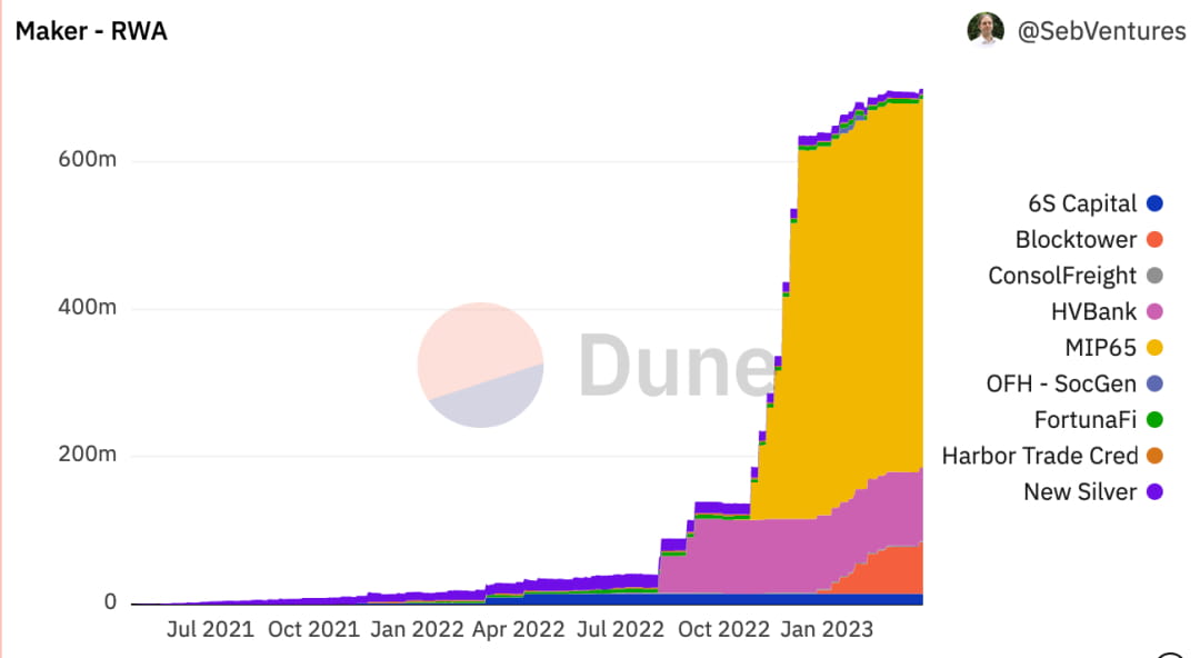 MakerDAO 在采用 RWA 方面有很大进展。目前,MakerDAO 拥有价值超过 6.8 亿美元的 RWA 支持的去中心化稳定币 DAI。