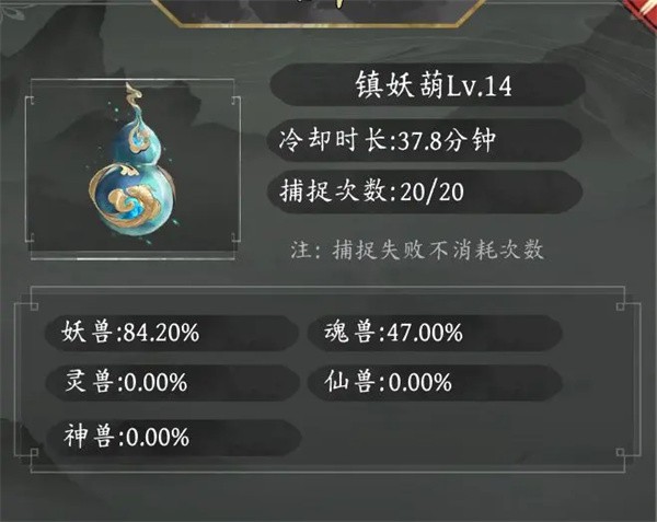 消耗“镇妖葫”次数,葫芦有冷却时间,可以增加次数,初始是20次,根据葫芦等级抓的宠物不同。